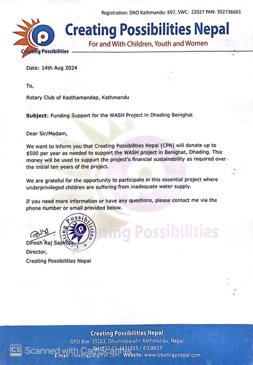 | (1) Our Club, Johns Creek-North Fulton Rotary Club (District 6900), reviews project proposals, provides feedback, assists with community assessments, provides funds, reviews progress reports, and conducts site visits. (2) The in-country Host Club, Kasthamandap Kathmandu Rotary Club (District 3292), manages grant funds, collects invoices, maintains financial records, spearheads monitoring and evaluation, supports implementation, and makes financial contributions. (3) Other Rotary Clubs provide financial support, including Roswell Rotary Club, Dunwoody Rotary Club, Sandy Springs Rotary Club, Alpharetta Rotary Club, Midtown Atlanta Rotary Club, and North Fulton Rotary Club. (4) The primary in-country cooperating organization, creating Possibilities Nepal, is the bridge between stakeholders, oversees execution, compiles measuring success surveys, monitors and reports, and oversees installation. (5) Other in-country partners include Janak Neupane (Engineer), who created the design plans and will spot-check installation; Shanti Nepal, which will deliver WaSH behavior change training; Benighat Rorang Rural Municipality, which is the local government providing ongoing funding; and the various School Management Committees, which will oversee sustainability and maintenance. (6) The Keenan Foundation has agreed to provide additional funding to the project for Sustainability, Maintenance, and Repairs for years 1-10, up to a maximum of $5,000/year, according to the need. (7) Himalayan Children's Charities (HCC), a nonprofit organization empowering orphaned and abandoned children in Nepal, provides in-country in-kind consulting support. HCC focuses on providing quality education, mentorship, and a nurturing family environment to help these children break the cycle of poverty and become community leaders. |